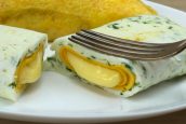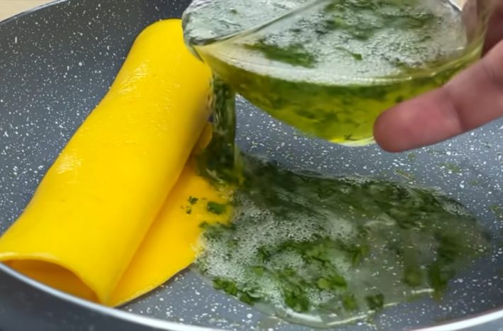 3. Nasekejte nadrobno lístky čerstvé petrželky a vmíchejte je spolu s trochou soli do odložených vaječných bílků. Směs dobře promíchejte. Žloutkovou omeletu umístěte k samému okraji plochy pánve tak, aby okraj zůstal ležet na dně. Přilijte polovinu rozšlehaných bílků a nechte je 2 až 3 minuty ztuhnout. Poté do nich zabalte žloutkovou omeletku, posuňte ji zpátky k okraji a postup opakujte i s druhou polovinou bílkové směsi.
