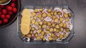 Vepřovou pečeni nakrájejte na plátky a ty rozdělte na větší kostky. Vhoďte je do zapékací misky či do pekáčku s vyššími stěnami a posypejte maso solí a mletým černým pepřem. Oloupejte dvě cibule, každou z nich překrojte na poloviny a ty nasekejte na tenké půlměsíčité plátky. Ty rozdělte na jednotlivé nudličky a posypejte jimi povrch masa. Nakládané okurky nakrájejte na kolečka a vyskládejte je na vrstvu cibule. Pak oloupejte brambory, rozkrájejte je na kolečka o síle kolem půl až jednoho centimetru, která vyskládejte s mírným přesahem na vrstvu nakládaných okurek.