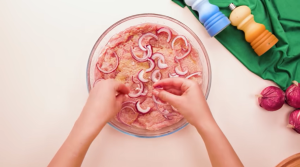 Maso nakrájejte na plátky a rozklepejte do tenka. Posypejte každý plátek solí a pepřem a vyrovnejte je do zapékací mísy a jejich povrch potřete hořčicí. Nakrájejte oloupanou cibuli na půlkulaté plátky a vyskládejte je na maso.