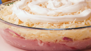 Oloupejte 3 brambory, nastrouhejte je na hrubém struhadle a vyrovnejte je na povrch masa. Nastrouhejte 300 gramů sýra, který máte rádi a rozložte jej na vrstvu brambor. Majonézu naplňte do zdobicího sáčku a vytlačte ji na povrch sýru do kruhu či spirály. Vložte misku na hodinu do trouby vyhřáté na 180 °C a pečte nejprve pod alobalem a později bez něj, aby sýr zčervenal. Před podáváním posypejte petrželkou nebo pažitkou.