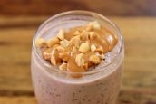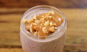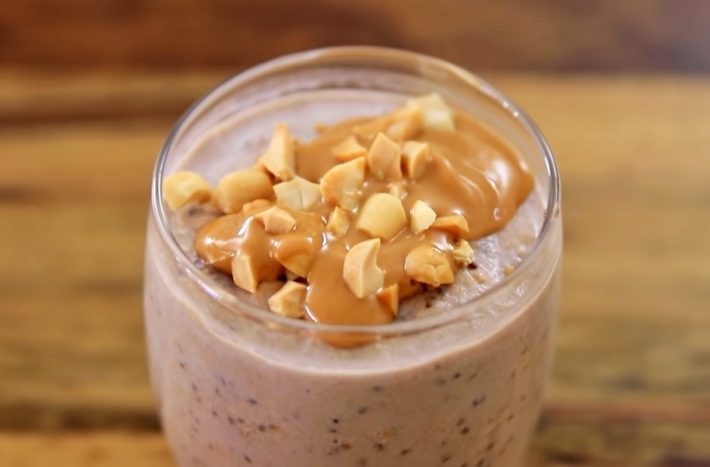 1. Ovesné vločky smíchejte se solí, chia semínky a přírodním arašídovým máslem. Přidejte ovocný džem dle svého výběru a vše zalijte mlékem a řeckým jogurtem.
