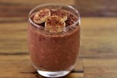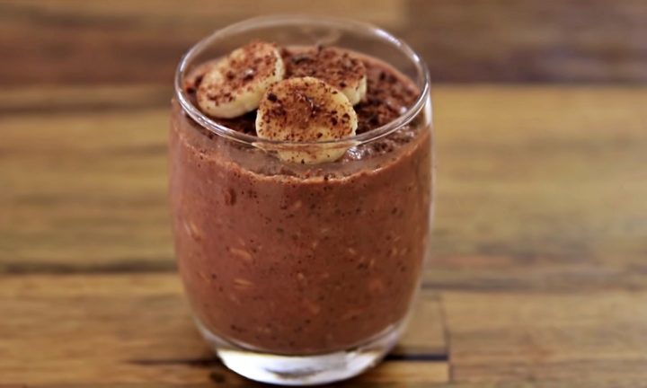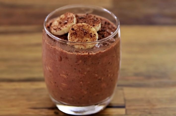 3. Směs nalijte do skleniček, nechte přes noc nabobtnat, ozdobte plátky banánu, posypejte strouhanou čokoládou a podávejte.