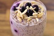 3. Přísady důkladně promíchejte, nalijte je do skleničky a vložte alespoň na 4 hodiny nebo lépe přes noc do lednice, aby se vločky a chia semínka nasákly vlhkostí a nabobtnaly. Hotový pohárek ozdobte borůvkami a plátky mandlí a podávejte.