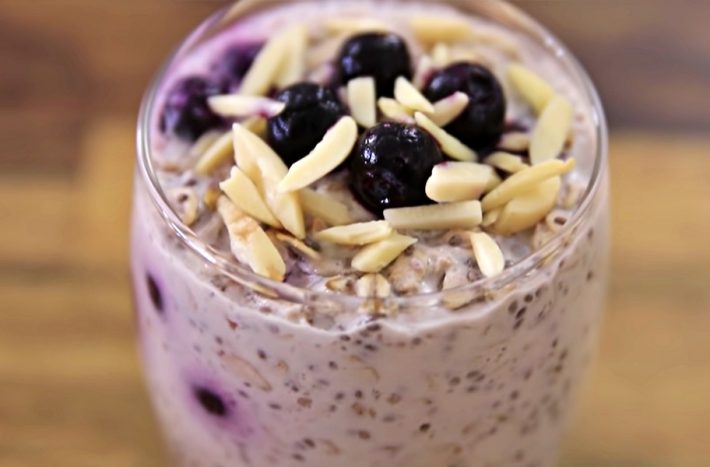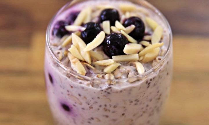1. Ovesné vločky vsypte do misky, přidejte k nim celé borůvky a chia semínka. Vše zalijte mandlovým či jiným vaším oblíbeným mlékem.
