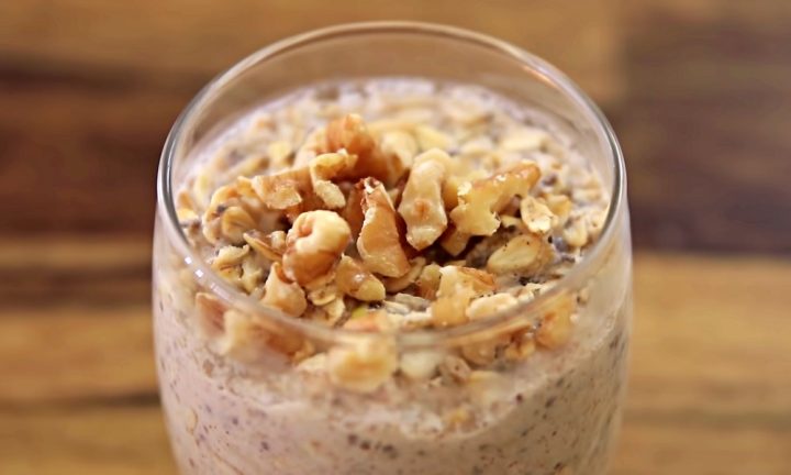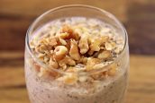 3. Směs oslaďte medem a promíchejte dohladka. Přelijte ji do skleničky, vložte přes noc odležet do lednice, ozdobte nasekanými ořechy a podávejte.
