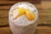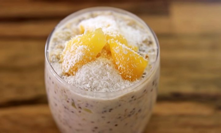2. Promíchejte dohladka, přelijte do skleničky a nechte přes noc uležet v lednici. Na druhý den ozdobte pohárky pár kousky ananasu, posypejte kokosem a podávejte.