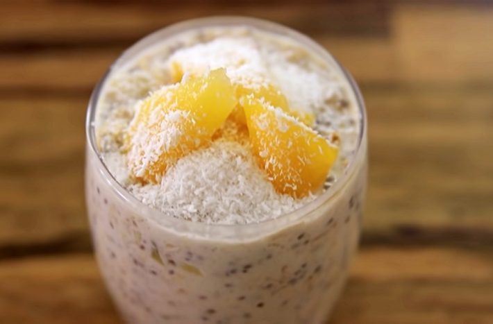 1. Ovesné vločky promíchejte s chia semínky a strouhaným kokosem. Přidejte čerstvý krájený ananas a vše zalijte mlékem, jogurtem, medem a vanilkovým extraktem.