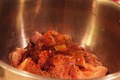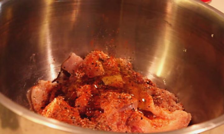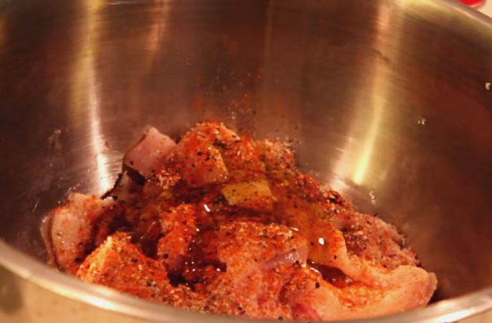Kuřecí prsní řízky nakrájejte na proužky. Vykostěná kuřecí stehna zbavte přebytečného tuku a rovněž je nakrájejte na menší kousky. Vložte je do misky a posypejte větším množstvím čerstvě mletého černého pepře, solí, sladkou paprikou a chilli. Vše zakapejte extra panenským olivovým olejem, promíchejte, aby se všechno maso obalilo kořením, a nechte jej 20 až 30 minut marinovat.