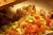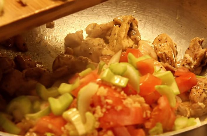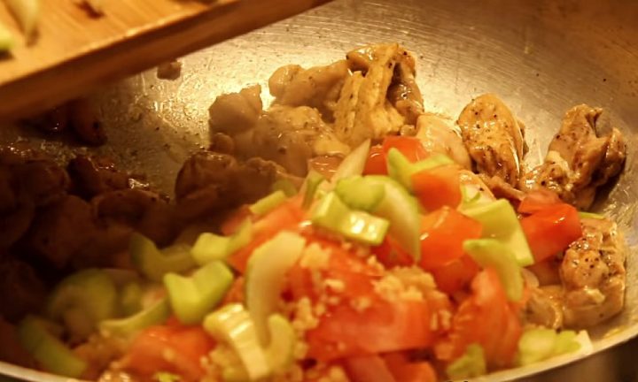V hrnci rozehřejte asi lžíci olivového oleje a přihoďte na něj kořeněné kuřecí maso, které nechte ze všech stran zprudka osmahnout. Přidejte pokrájenou zeleninu a pokračujte v restování.