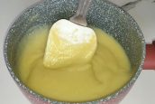 Mezitím se vrhněte na přípravu krému. Žloutky dejte do hrnce spolu s vanilkovým a moučkovým cukrem, promíchejte stěrkou do hladka a přimíchejte mouku s mlékem. Vařte za stálého míchání, dokud krém nezhoustne, a poté přendejte do hluboké mísy. Zakryjte povrch krému potravinářskou fólií a nechejte vychladnout na pokojovou teplotu.