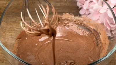 Vejce vyšlehejte s cukrem a špetkou soli do pěny. Přidejte mouku, a jakmile se ingredience propojí, také kakao.