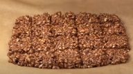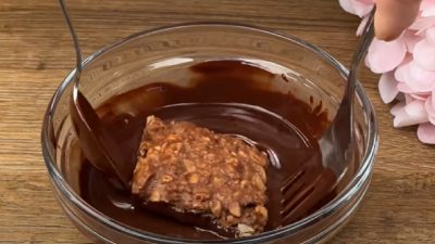Arašídové kostky následně pečte v předehřáté troubě na 180 °C po dobu 20 minut. Upečený dezert nechte vychladnout a obalte ho v hořké čokoládě, smíchané s olejem. Po zaschnutí čokolády můžete pochoutku servírovat.