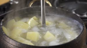 Oloupejte brambory a nakrájejte je na malé kostky. V hrnci na kamnech přiveďte k varu vodu. Když začne bublat, vsypte do ní sůl, zamíchejte, aby se rozpustila a přidejte brambory, které vařte doměkka.