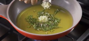 Mezitím, co se brambory vaří, nasekejte tři větvičky čerstvého rozmarýnu na jemné kousky. Tři stroužky česneku oloupejte a prolisujte. Na kamnech rozpalte pánev s olivovým olejem. Když je horký, vsypte do něj nasekaný rozmarýn a prolisovaný česnek. Za stálého míchání fritujte zeleninu, dokud kousky česneku nezezlátnou. Pak pánev odstavte z ohně a olej slijte do misky přes jemné sítko. Zbytky rostlin můžete vyhodit.