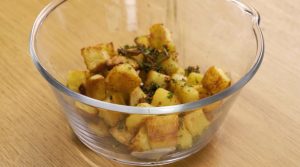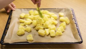 Když jsou brambory uvařené, slijte z nich vodu a nechte je chvilku zchladnout a odpařit zbytky vlhkosti. Pak brambory vsypte do mísy s aromatizovaným bylinkovým olejem a velmi dobře je promíchejte. Připravte plech vyložený pečicím papírem, vsypte na něj brambory, rozložte je tak, aby byly po celé ploše a nepřekrývaly se. Vložte plech do trouby, kterou jste nechali předehřát na 200 °C a pečte je zhruba po dobu 20 minut, dokud se na povrchu brambor nevytvoří krásná zlatavá kůrčička. V průběhu pečení brambory několikrát otočte na druhou stranu.