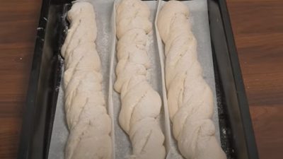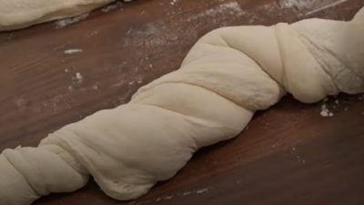Druhý den povrch těsta posypte trochou mouky a vytvořte z něj plát, ve tvaru obdélníku, o výšce 1 cm. Ten rozdělte na tři stejné části, z nichž každou několikrát spirálovitě zatočte tak, aby se vaše ruce otáčely do protisměru.