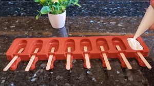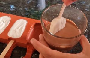 Do každé položte dřívko a naneste do ní banánovou směs. Umístěte formu do mrazáku na šest hodin a poté připravte polevu. Rostlinný olej smíchejte s nalámanou čokoládou za stálého ohřívání v mikrovlnné troubě či ve vodní lázni. Každý nanuk obalte v rozehřáté polevě a nechejte ho okapat. Jakmile poleva zatuhne, můžete nanuky podávat, dobrou chuť!