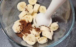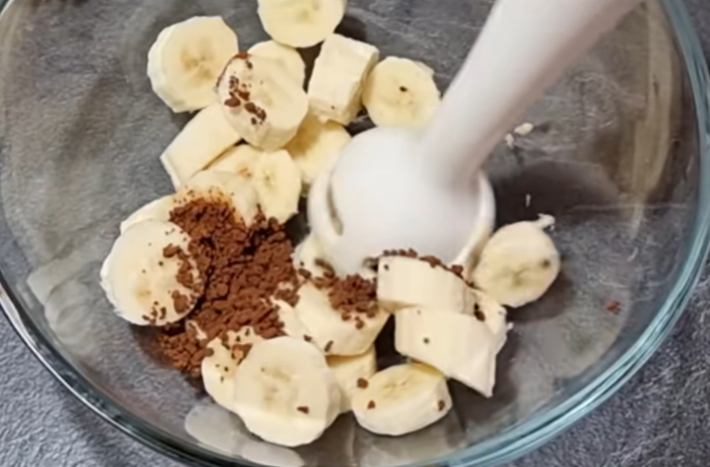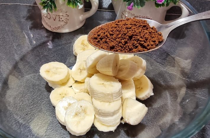 Připravte si velkou hlubokou misku, do které nakrájejte na plátky oloupané banány. Přidejte lžíci instantní kávy a směs rozmixujte pomocí tyčového mixéru dohladka. Do směsi rozklepněte čerstvé vajíčko a vyšlehejte pomocí kovové metly spolu s přidaným cukrem.