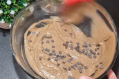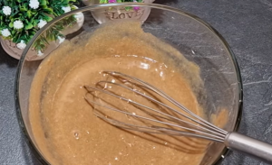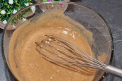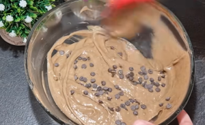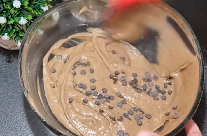 Směs by měla být zcela hladká. Za stálého míchání přilijte olej, přisypejte prosátou mouku a prášek do pečiva, lehce osolte. Metličkou stále míchejte. Přisypejte čokoládové lupínky, které opatrně vmíchejte do těsta s pomocí vařečky. Kupované čokoládové pecky nebo lupínky lze nahradit nadrcenou zbylou čokoládou ze spíše.