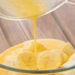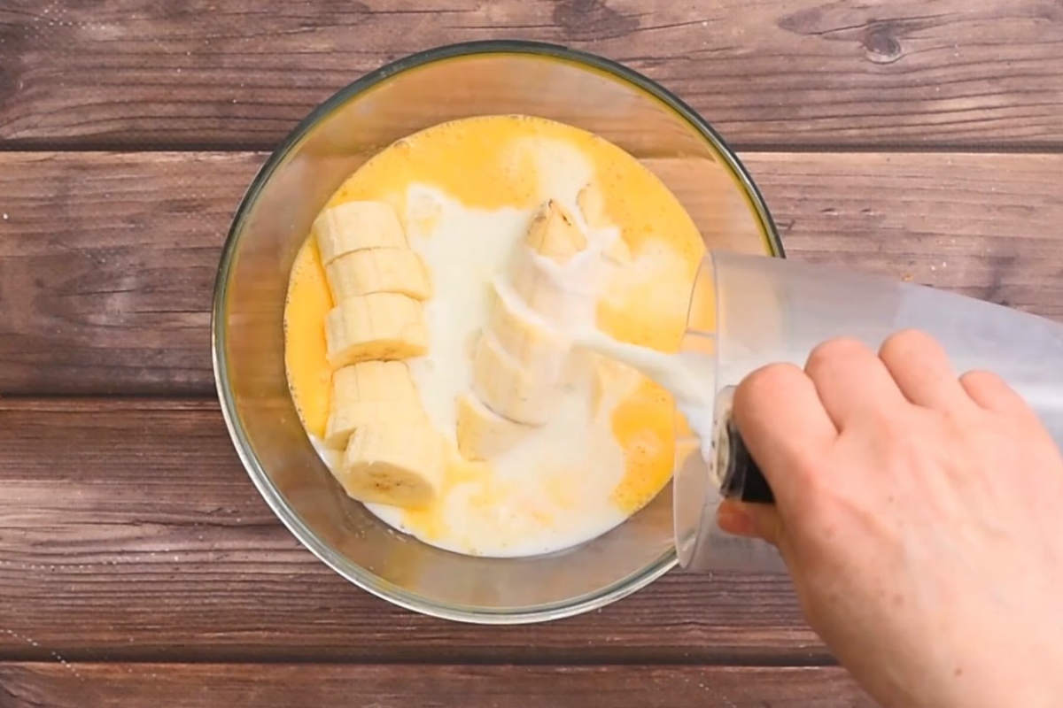 Oloupejte banány a nakrájejte je na kousky. Vhoďte je do mixéru, přidejte k nim rozšlehaná vajíčka s octem, přilijte dva decilitry mléka a rozmixujte vše do hladké a jednolité směsi.