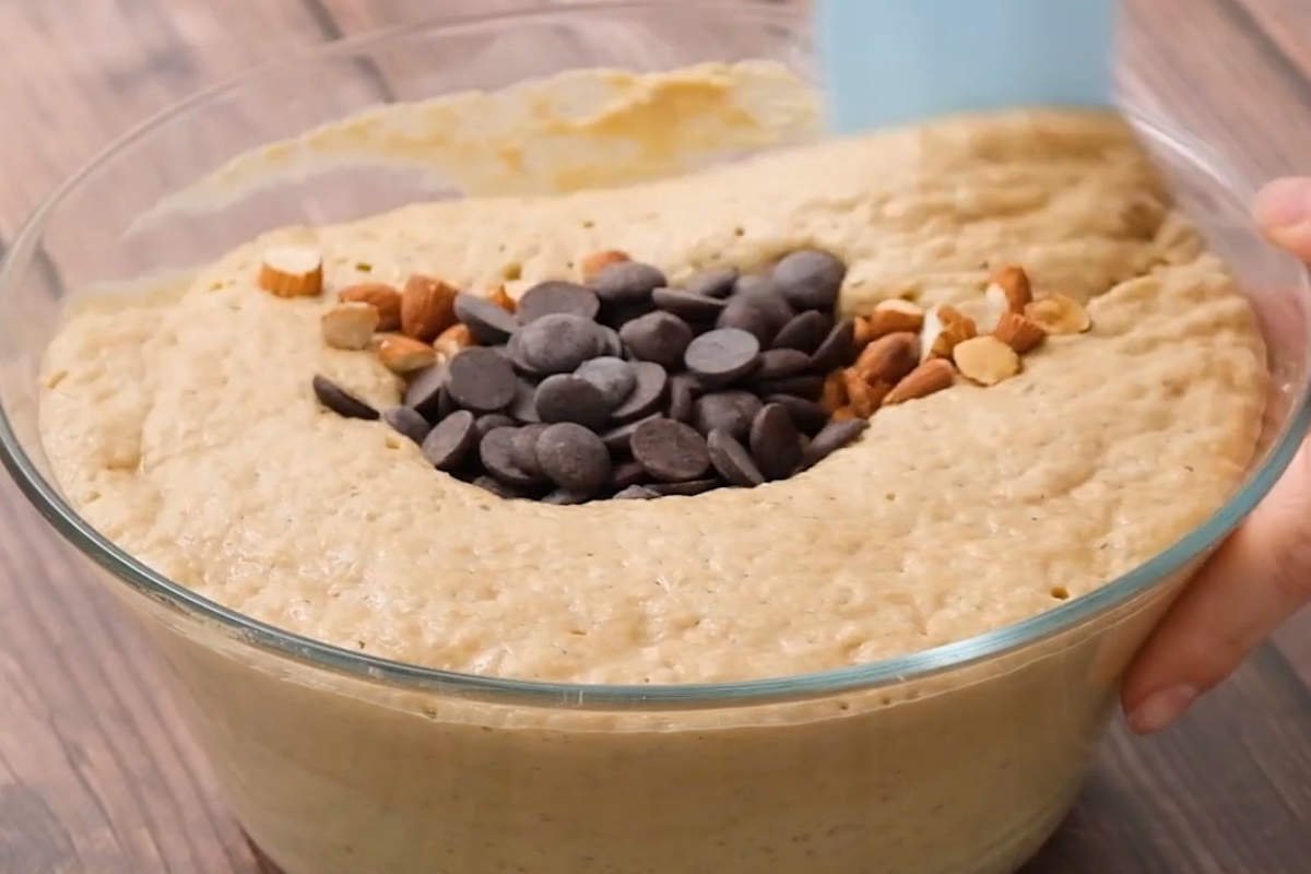 Čokoládu rozlámejte na malé kousky a rovněž je přidejte do banánového těsta. Pak jej dobře promíchejte, aby se oříšky a čokoláda dostaly do všech částí těsta.