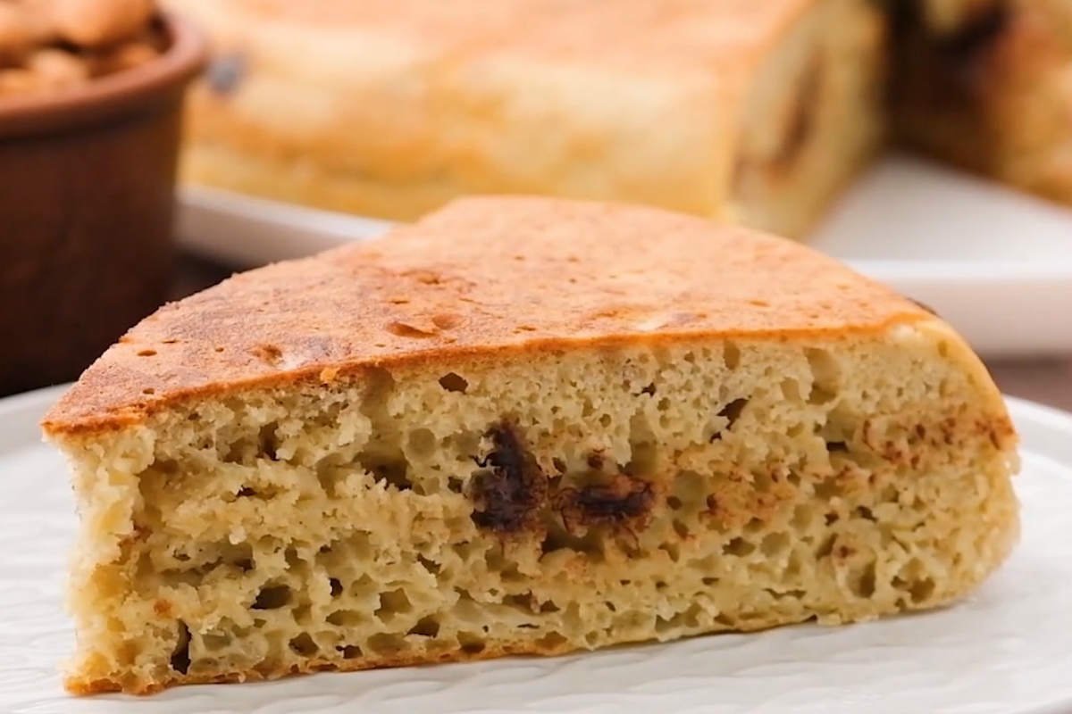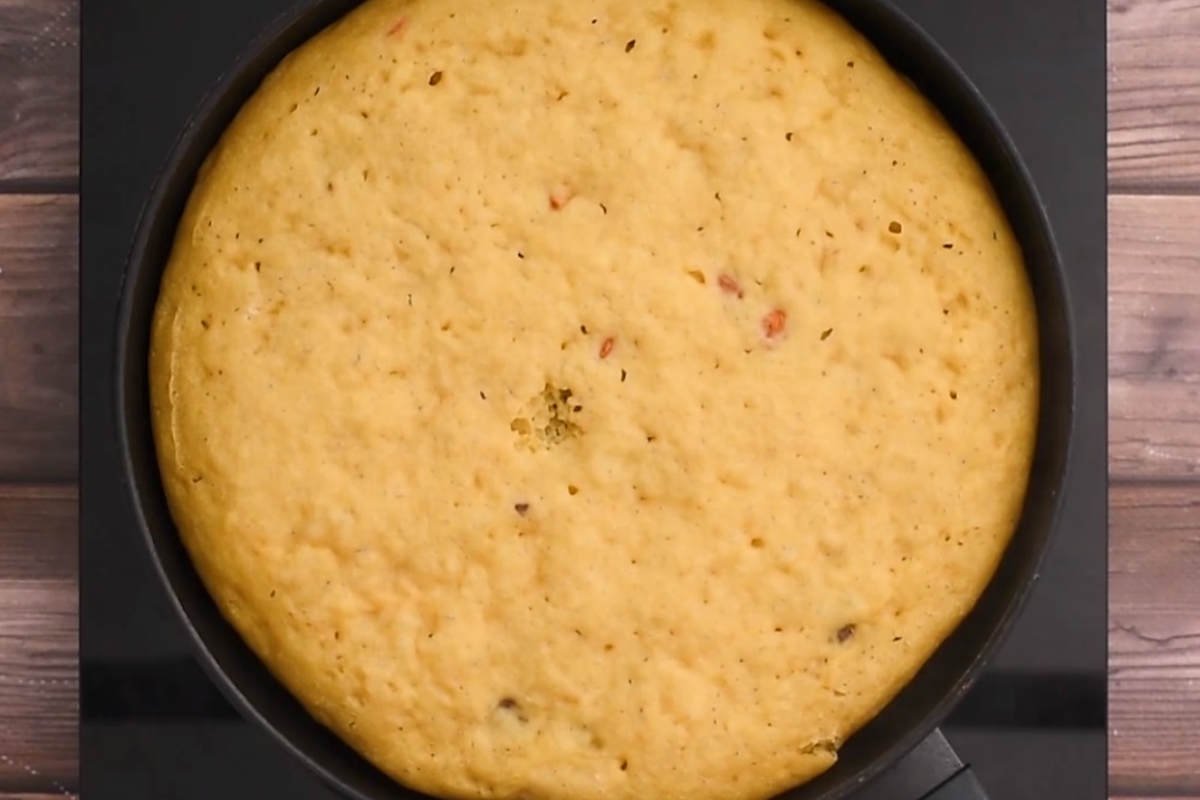 Připravte si vhodnou hlubší pánev se silnějším dnem, vymastěte ji rostlinným olejem nebo máslem a vlijte do ní těsto. Zakryjte pokličkou, položte na kamna a na středním ohni smažte, dokud vrchní část koláče neztuhne. To bude trvat kolem 30 až 40 minut. Pak opatrně dort otočte, aby se opekl i z druhé strany a dopékejte dalších 5 až 10 minut.