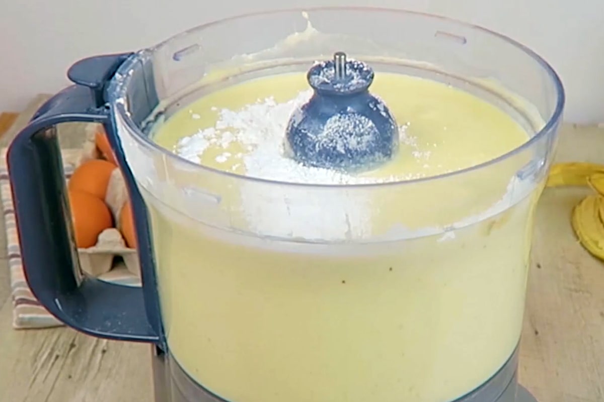 V mixéru rozšlehejte 3 banány s rostlinným olejem. Poté přidejte cukr a vejce. Hmotu šlehejte zcela do hladka, minimálně po dobu 5 minut.