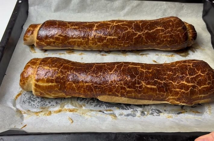 Vršek obou závinů potřete rozšlehaným žloutkem a nechte je 30 minut kynout. Poté vložte plech do předem vyhřáté trouby na 190 °C a pečte je 30 až 35 minut.