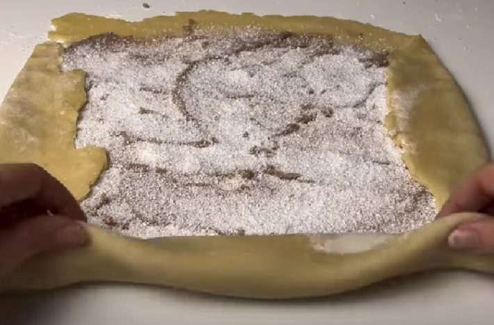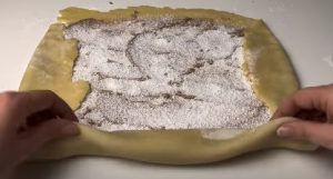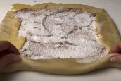 Těsto dejte na mírně pomoučněný vál a rozdělte ho na 2 části. Z každé uválejte tenkou obdélníkovou placku. Potřete ji sladkou kaštanovou náplní a posypejte trochou kokosu. Můžete ale zvolit libovolnou náplň, kterou máte rádi. Nerovné okraje přehněte dovnitř, díky čemuž vám vznikne pravidelný obdélník. Ten srolujte a dejte na plech vyložený pečicím papírem.