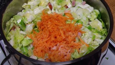 Směs přendejte do většího hrnce, kde ji smíchejte s nakrouhaným zelím, vroucí vodou, bobkovým listem, novým kořením a kuličkami pepře. Přidejte oloupanou a nahrubo nastrouhanou mrkev, směs osolte a duste 25–30 minut, pod pokličkou.