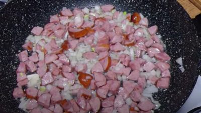 Na pánvi s rozpáleným olejem smažte nakrájenou klobásu 2–3 minuty. Ke klobáse přidejte nadrobno nakrájenou cibuli a směs smažte další 2–3 minuty.