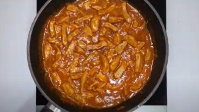 Následně přidejte sójovou omáčku, mletou sladkou papriku, ingredience zalijte vývarem, důkladně je promíchejte a vařte 40 minut, pod pokličkou.