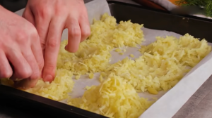 Vařené brambory nejprve oloupejte a poté si vezměte do ruky struhadlo. Ideální je použít jeho hrubou stranou. Tou všechny připravené brambory nastrouhejte. Buď do mísy, nebo přímo na plech vyložený pečicím papírem. V obou případech z brambor následně na plechu vytvořte dostatečně velká hnízda, do kterých se bude vkládat potřebná náplň.