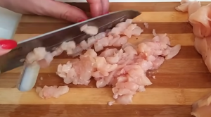 Kuřecí prsíčko očistěte od šlach a blanek a nakrájejte ho na tenké plátky, které pak naplocho rozkrájejte na dlouhé a tenké nudličky. Ty pak nakrájejte na co nejjemnější kostičky a co nejlépe je rozmělněte a nasekejte nožem. Maso pak vložte do hluboké mísy.