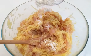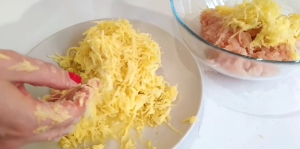 Oloupejte tři brambory a nastrouhejte je na hrubém struhadle do misky. Posypejte je trochou soli a počkejte, až z nich vyteče přebytečná šťáva, kterou pak slijte přes cedník a důkladně vymačkejte. Brambory zbavené šťávy pak vložte do mísy k nasekanému kuřecímu masu.