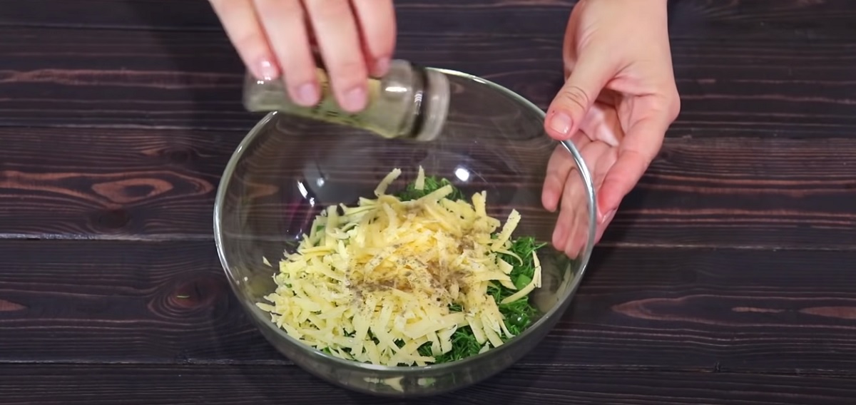 Začněte tím, že si nahrubo nastrouháte tvrdý sýr dle preferencí. Pak ho v míse promíchejte spolu s vejci, solí, mletým pepřem a jemně nasekanými bylinkami.
