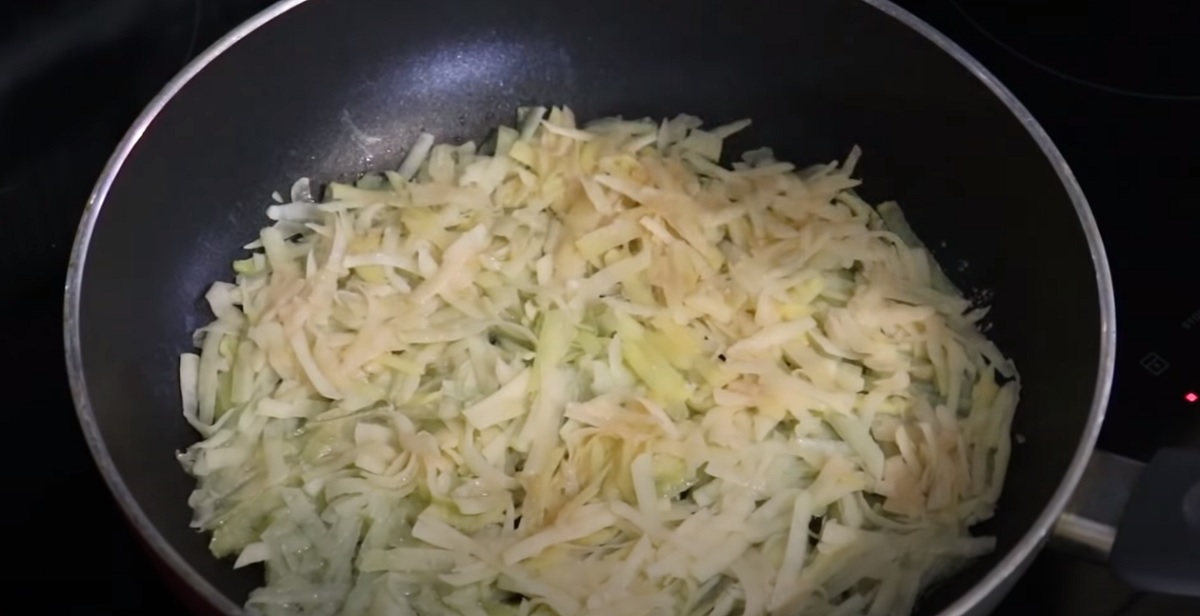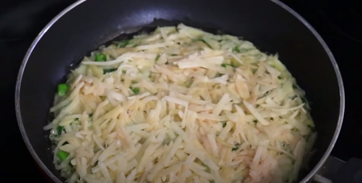 Nyní si k ruce vezměte velkou pánev a na ní rozpalte slunečnicový olej. Na něj pak rozprostřete polovinu strouhaných brambor.