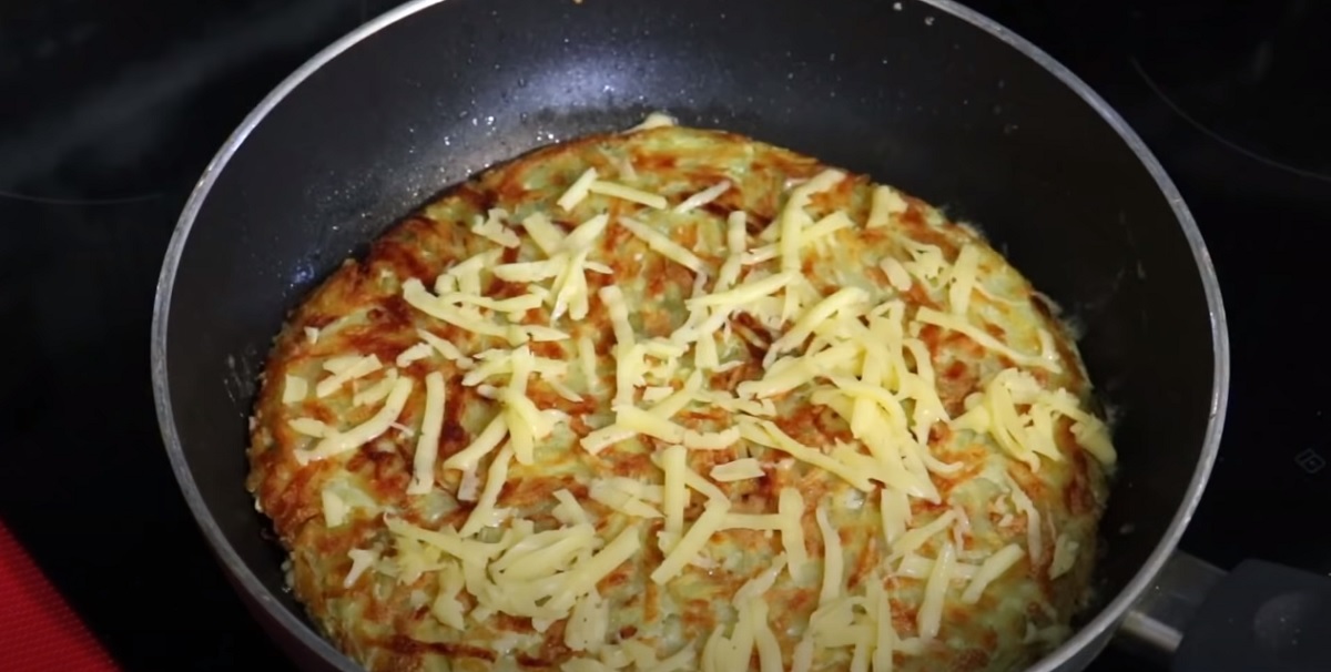 Hotovou bramborovou placku se sýrem a vejci můžete před podáváním ještě posypat sýrem na povrchu.