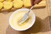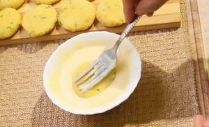 Rukama odebírejte kousky připraveného těsta zhruba o velikosti dlaně. Zformujte z nich nejprve kouli a poté ji rozplácněte na silnou kulatou placku. Takto zpracujte veškeré těsto. Do misky vyklepněte vajíčko, přidejte jednu lžíci mouky a lžíci bílého jogurtu.