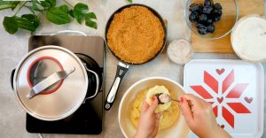 Zatímco brambory chladnou, využijte čas na přípravu švestek. Umyjte je důkladně ve vodě a dobře je osušte papírovými utěrkami. Pak odstraňte stopky a rozkrojte švestky jenom tak moc, abyste vyndali ven pecky. Jinak nechte obě poloviny u sebe. V misce smíchejte cukr se skořicí a odložte stranou. Pak připravte ještě strouhanku. Na kamnech rozehřejte suchou pánev, vsypte na ni strouhanku a na středním ohni ji za častého míchání opékejte, dokud ze všech stran nezíská krásnou zlatavou barvu. Pak k ní přidejte 50 g másla, promíchejte a odstavte z kamen.