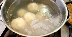 Do velkého hrnce nalijte vodu a přiveďte ji k varu. Jakmile začne divoce bublat, vložte do vody opatrně první várku knedlíků (asi 5 až 6 kusů) a vařte je tak dlouho, dokud samy nevyplavou na hladinu. Pak je na mírném ohni vařte ještě další 3 až 4 minuty a děravou lžící je vyndejte ven z vody. Ihned po vyjmutí je obalte v restované strouhance a odložte na talíř.