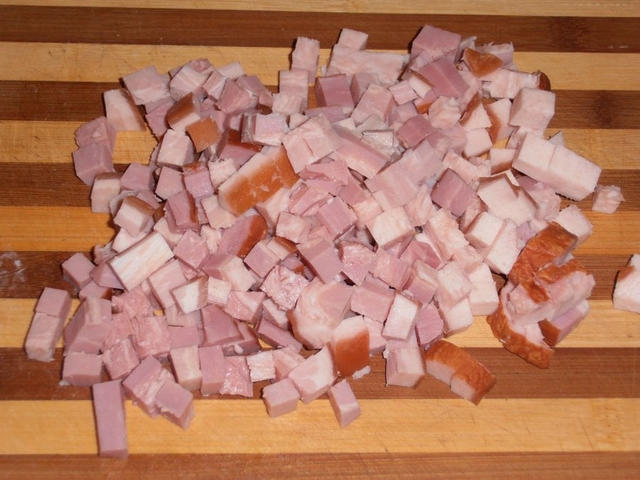 Ze všeho nejdříve si nachystejte všechny suroviny. Nastrouhejte sýr do misky na hrubém struhadle a odložte jej stranou. Cibuli oloupejte, překrojte ji na poloviny a ostrým nožem ji nasekejte najemno. Uzené maso nebo slaninu pokrájejte na malé kostičky. Brambory oloupejte a nastrouhejte je na jemném struhadle.