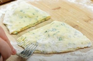 Mezitím si mozzarellu rozdělte na 8 dílů. Poprašte vál moukou, vyklopte na něj těsto a to v mouce jakoby obalte. Pak ho rozdělte na 4 kusy. Z každého uválejte kulatou placku a tu rozdělte napůl. Pak na každou půlku na jednu stranu dejte kus sýru. Přeložte těsto, aby vznikl jakýsi trojúhelník. Okraje těsta spojte prsty a nakonec přitlačte z obou stran vidličkou.