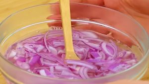 Brambory uvařte ve slupce do změknutí tak, jak jste zvyklí. Jakmile vychladnou, oloupejte je a nakrájejte na menší kousky. Dejte je do větší mísy, ve které budete salát připravovat. Cibuli oloupejte a nakrájejte ji na malé proužky. Dejte ji do menší mísy, přidejte k ní cukr, sůl, ocet a zalijte ji horkou vodou. Promíchejte ji a nechejte ji na 10 až 15 minut odpočívat.