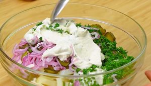 Obojí spolu důkladně promixujte. Poté do směsi přidejte sůl, mletým černý pepř, granulovaný česnek, ocet a hořčici. Znovu směs promixujte, dokud se všechny suroviny nespojí. Poté ji přidejte do salátu a důkladně ho promíchejte. Následně máte hotovo a salát můžete podávat, dobrou chuť!