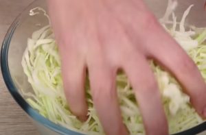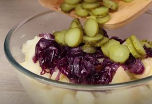 Uvařené brambory oloupejte, nakrájejte na menší kusy a dejte je k zelí. Cibuli nakrájejte na půlkolečka a dejte ji na troše oleje smažit na pánvi. Přisypejte lžičku cukru, aby zkaramelizovala, a smažte asi 5 minut. Pak ji dejte do mísy. Nakrájejte kyselé okurky na kolečka a dejte je do mísy.