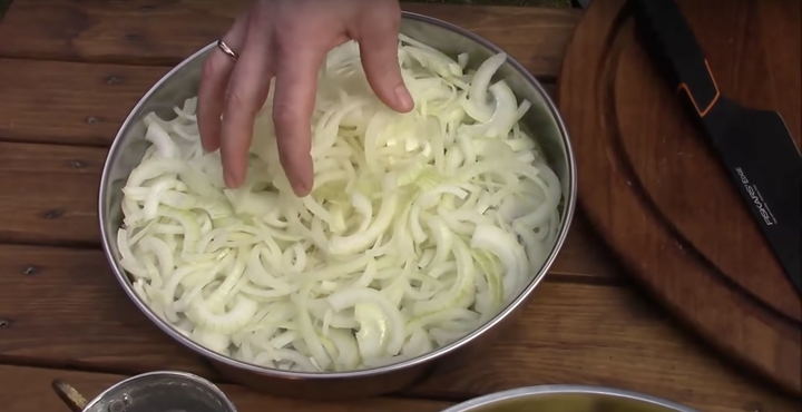 Oloupejte také cibuli, překrojte ji na poloviny a ty nakrájejte na půlkruhové proužky, které od sebe jemně oddělte rukama.