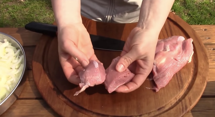 Maso omyjte a osušte a nakrájejte ho na větší kostky (asi jako krájíte na guláš).