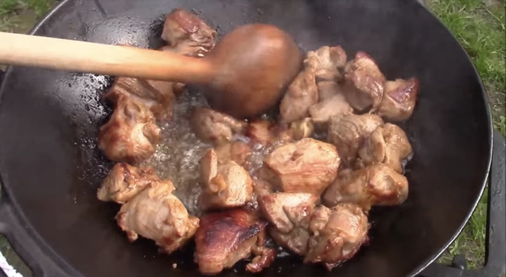 Rozehřejte nad ohněm kotlík (nebo na kamnech pánev) na vysokou teplotu a rozpusťte v něm vepřové sádlo, případně slunečnicový olej (jestliže použijete sádlo, dejte si pozor, aby vám nezačalo hořet, má totiž nižší bod vzplanutí). Na pánev přidejte maso a smažte ho ze všech stran dozlatova. S tímto krokem nespěchejte. Čím lépe maso osmažíte, tím více chuti a vůně bude v hotovém pokrmu.