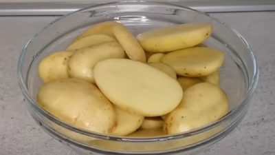 Brambory oloupejte, nakrájejte na poloviny a vařte je v osolené vodě 3 minuty, pod pokličkou. Poté je sceďte a nechte je chvilku chladnout.